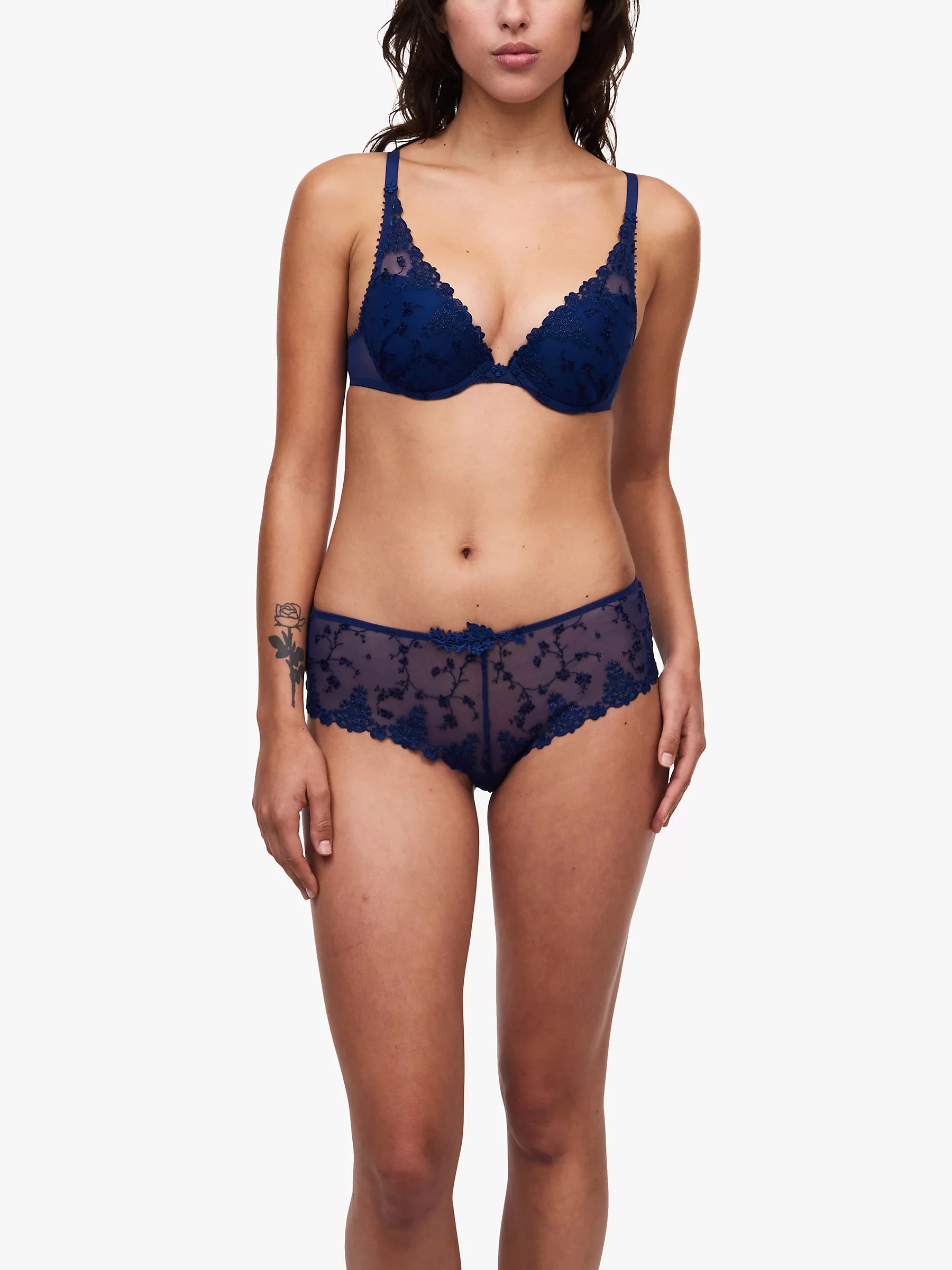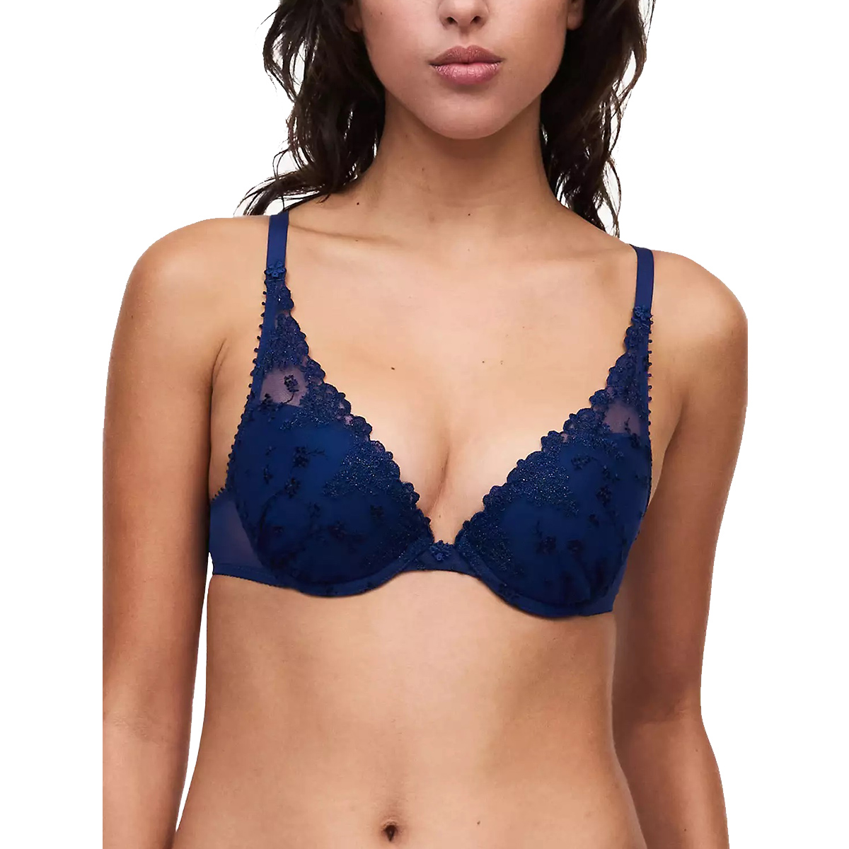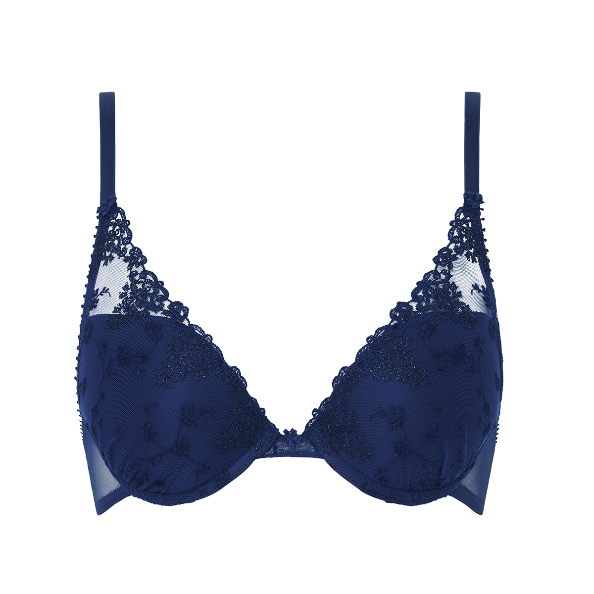 Уплотненный бюстгальтер пуш ап с интегрированными подушками и красивым глубоким декольте; чашки задрапированы тонким тюлем с нежной цветочной вышивкой по фону и контрастной вышивкой по краю декольте; между чашками и у основания бретелек - крошечные цветочки.