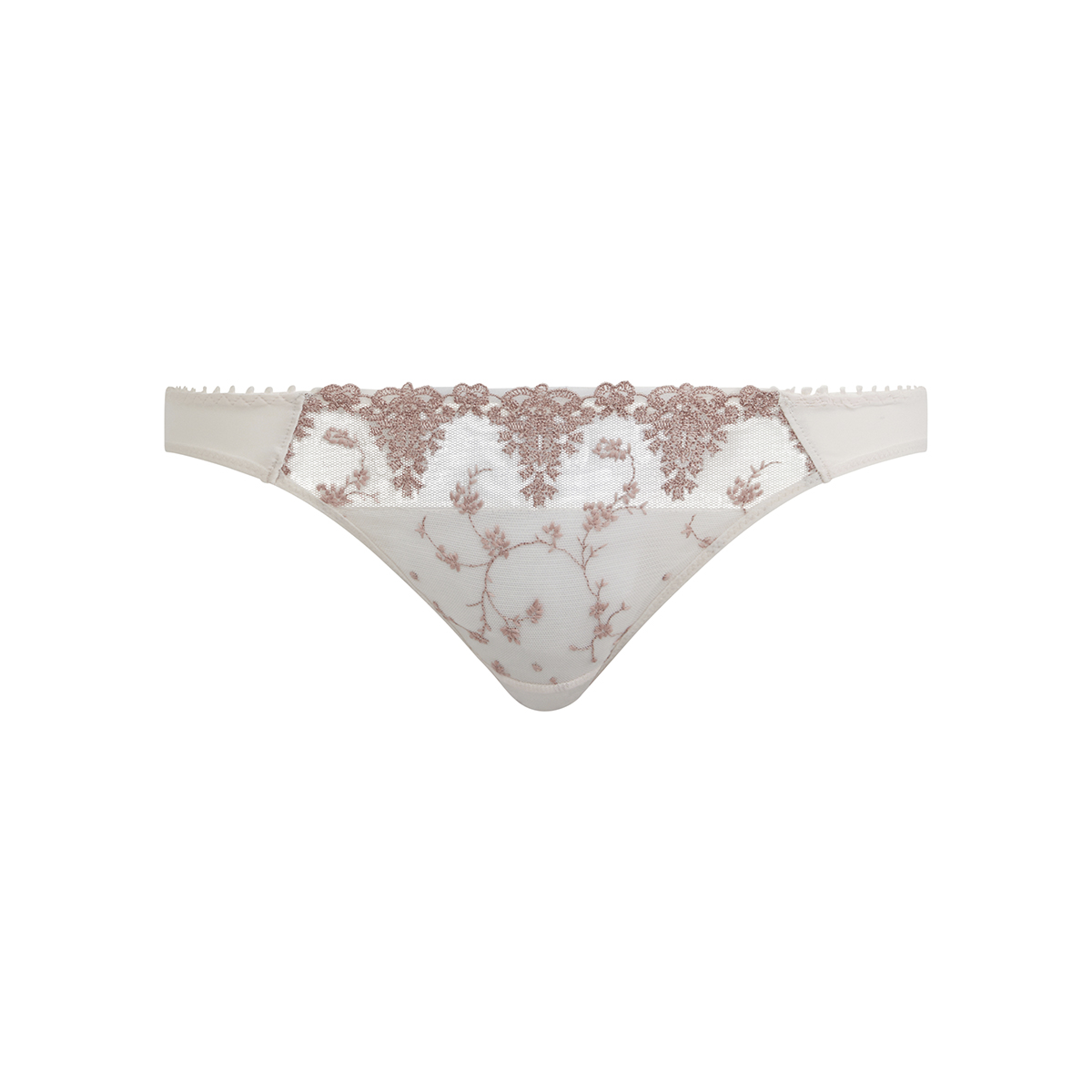 классическая среднезаниженная закрытая форма трусиков; передняя панель дублирована и выполнена из тюля с нежной цветочной вышивкой по фону и контрастной вышивкой возле пояса; задняя панель из микрофибры; хлопковая ластовица.