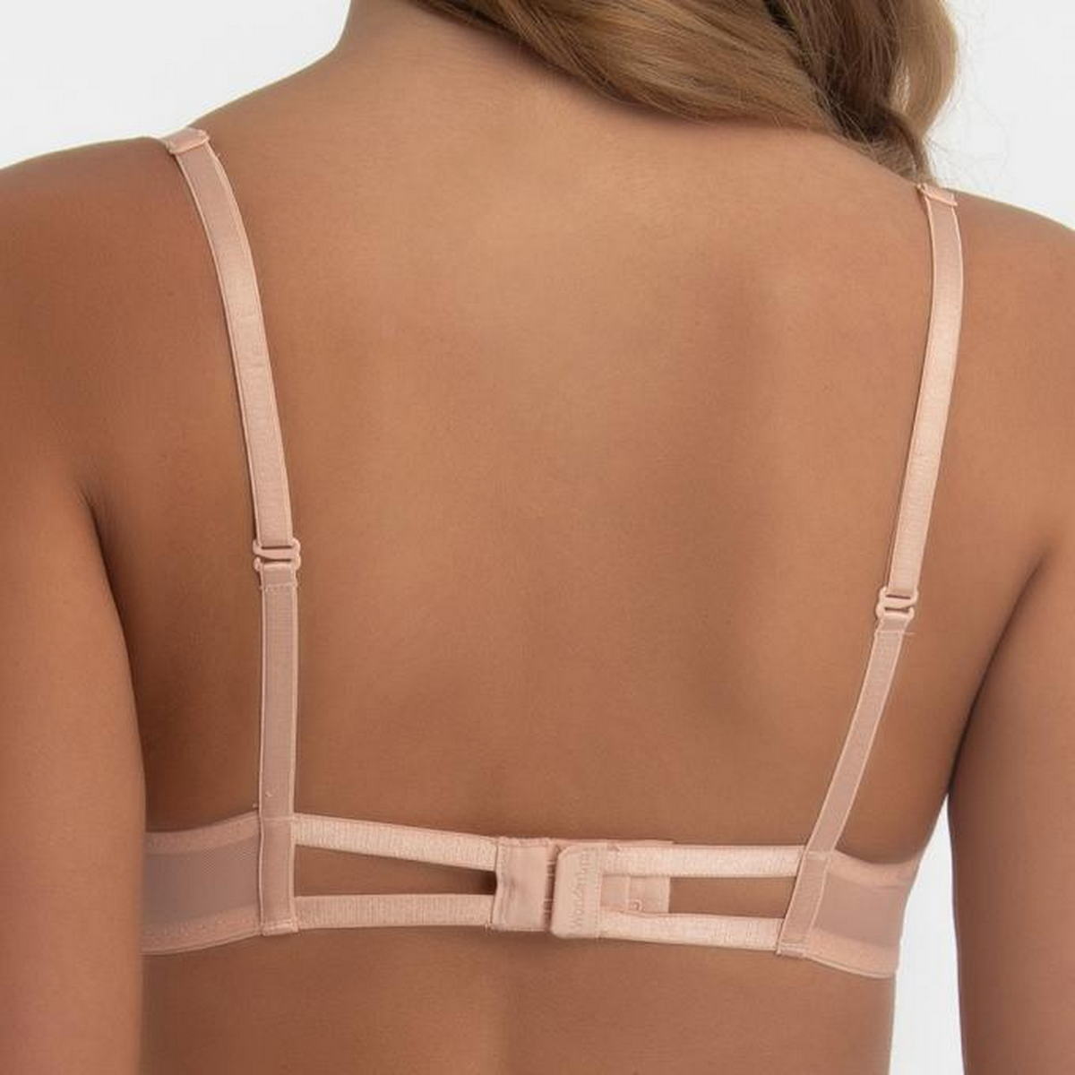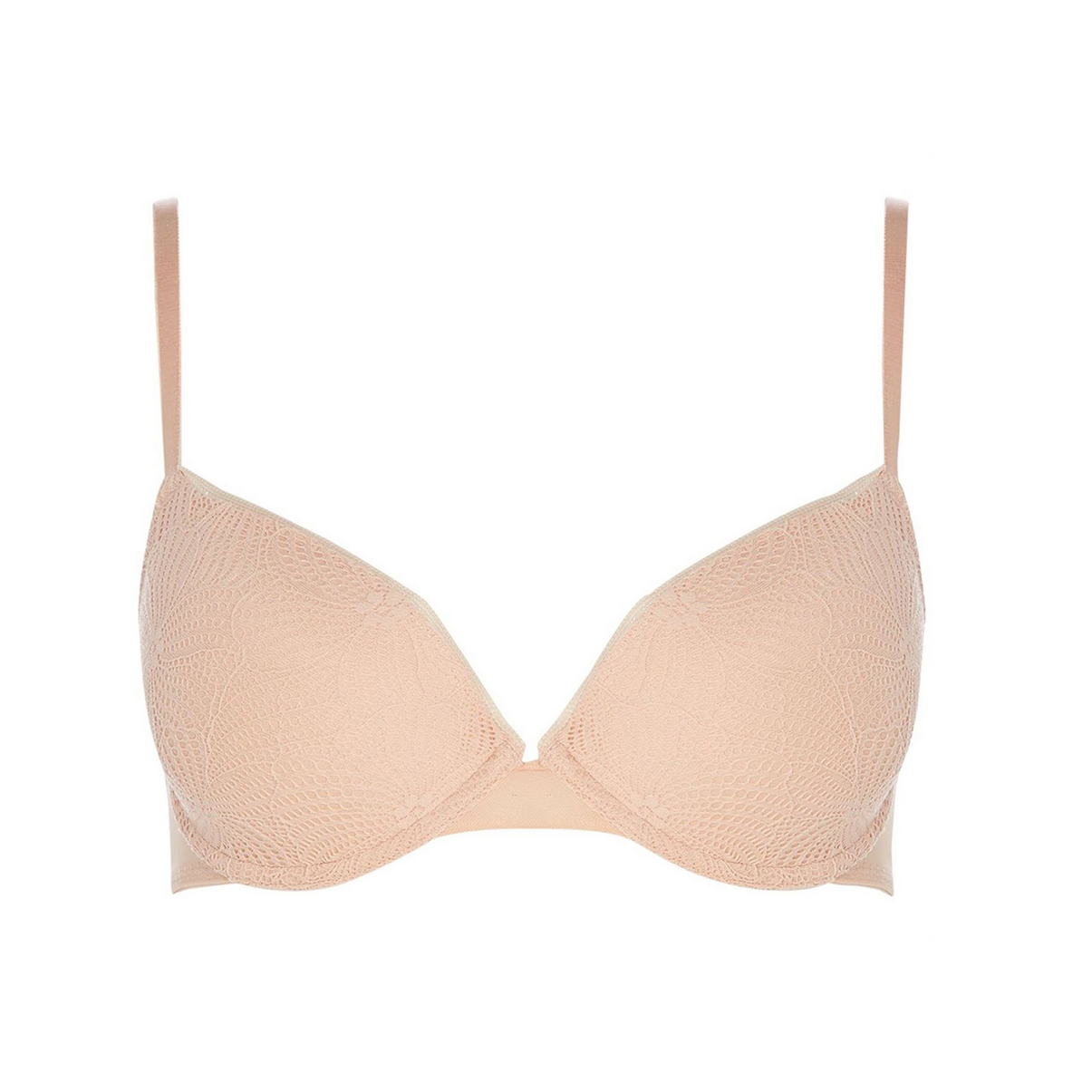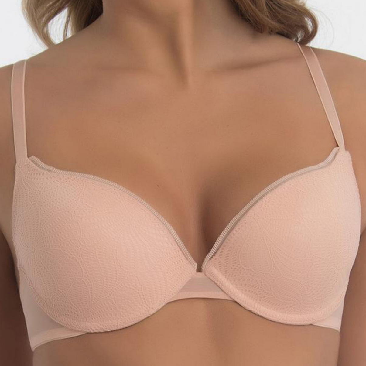 Бюстгальтер с формованной формой чашек с небольшой прослойкой мусса. Чашки покрыты плоским кружевом с цветочным мотивом. Область декольте обрамлена декоративной тесьмой. Регулирующиеся бретели.