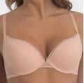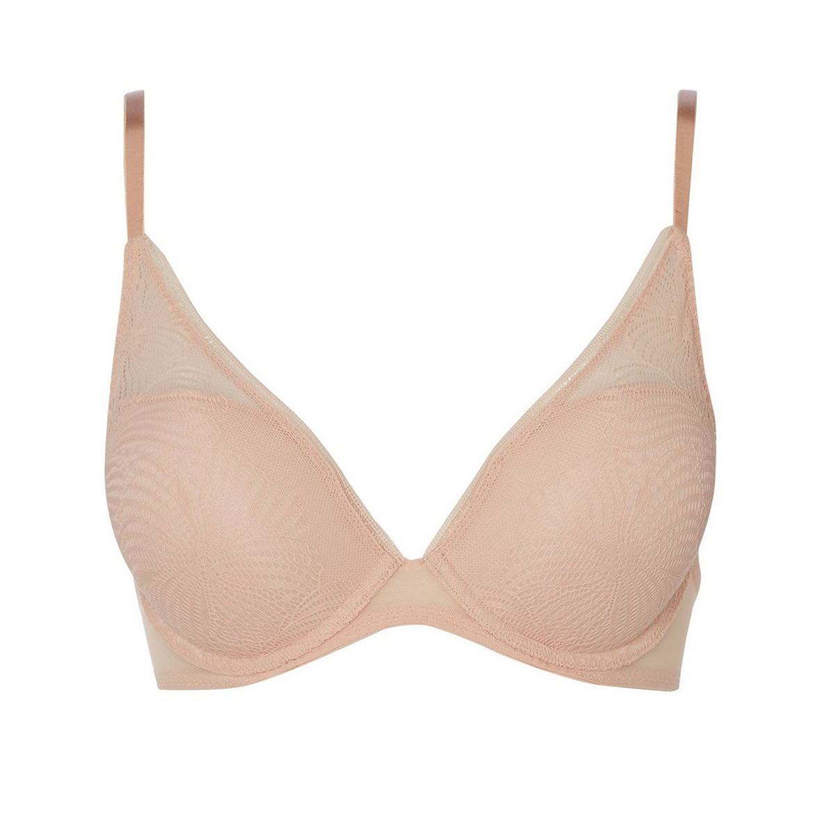 Бюстгальтер-пуш ап с толстой прослойкой из мусса. Чашки покрыты плоским кружевом с цветочным орнаметом, которое плавно перетекает на бретели. Область декольте обрамлена декоративной тесьмой. Регулирующиеся бретели.