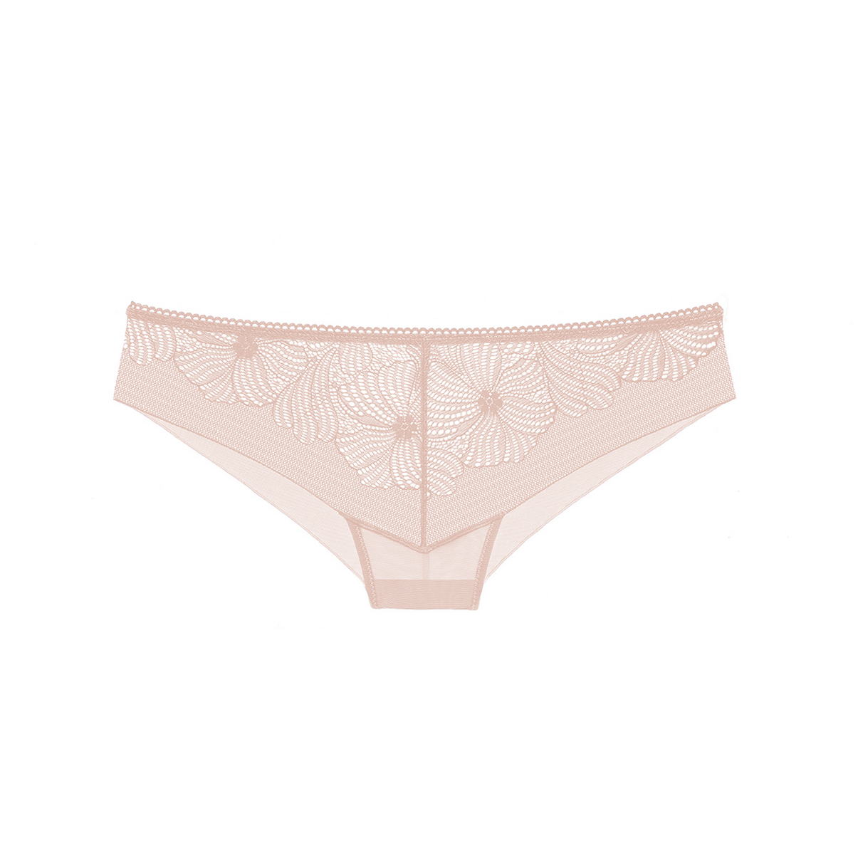 Трусы-бикини со средне-заниженной посадкой. Передняя панель, практически, полностью выполнена из плоского кружева с цветочным орнаментом, задняя - из прозрачной микрофибры.