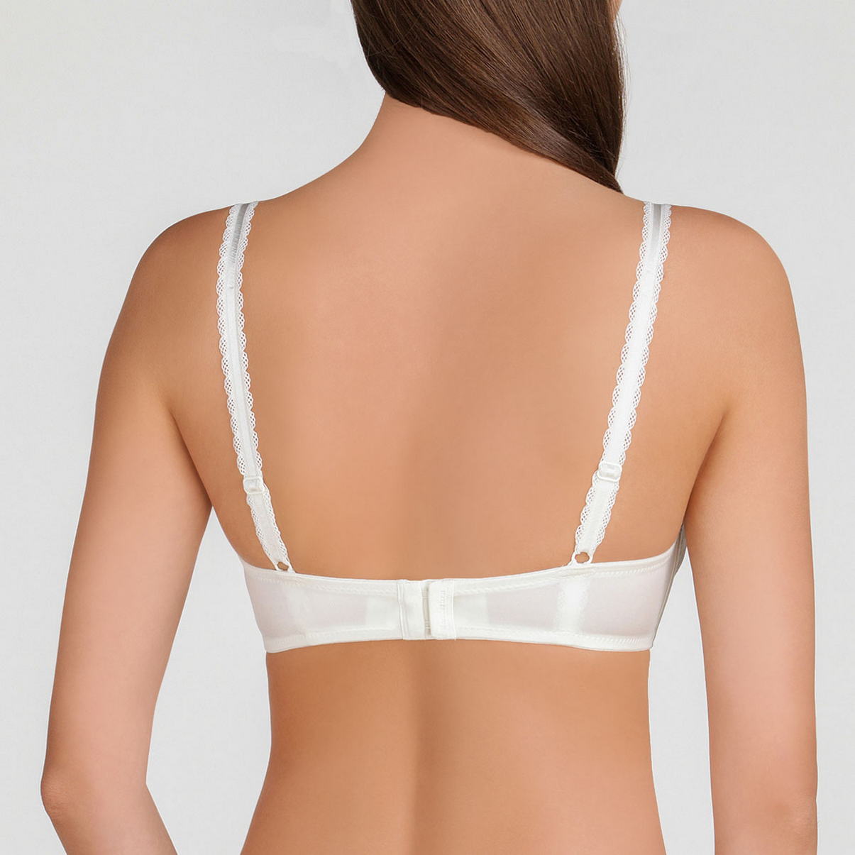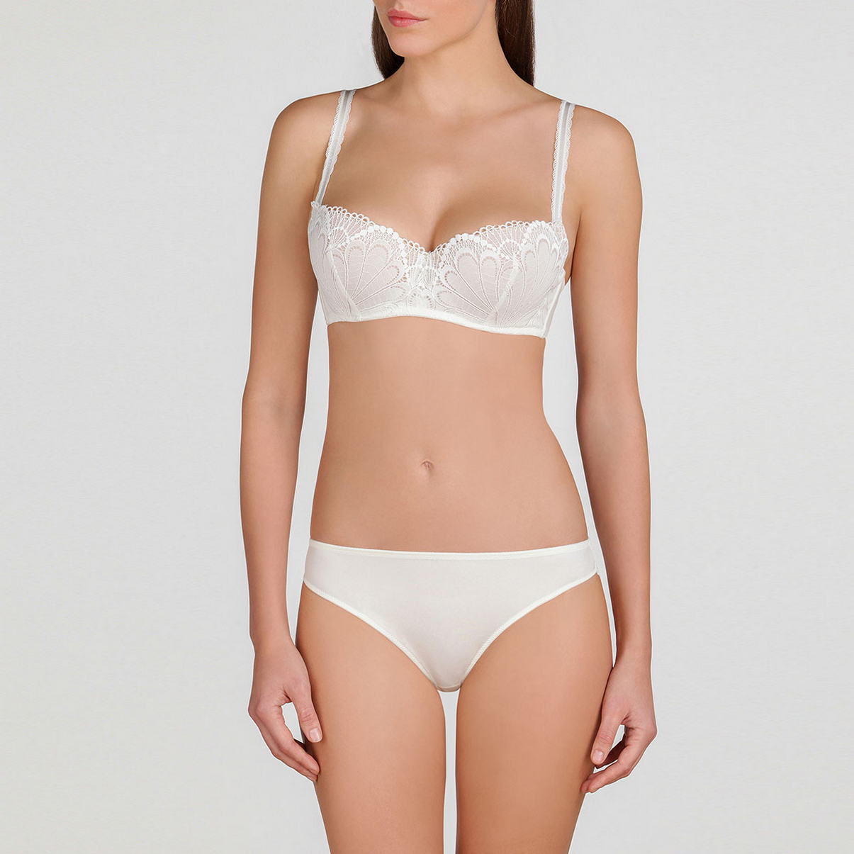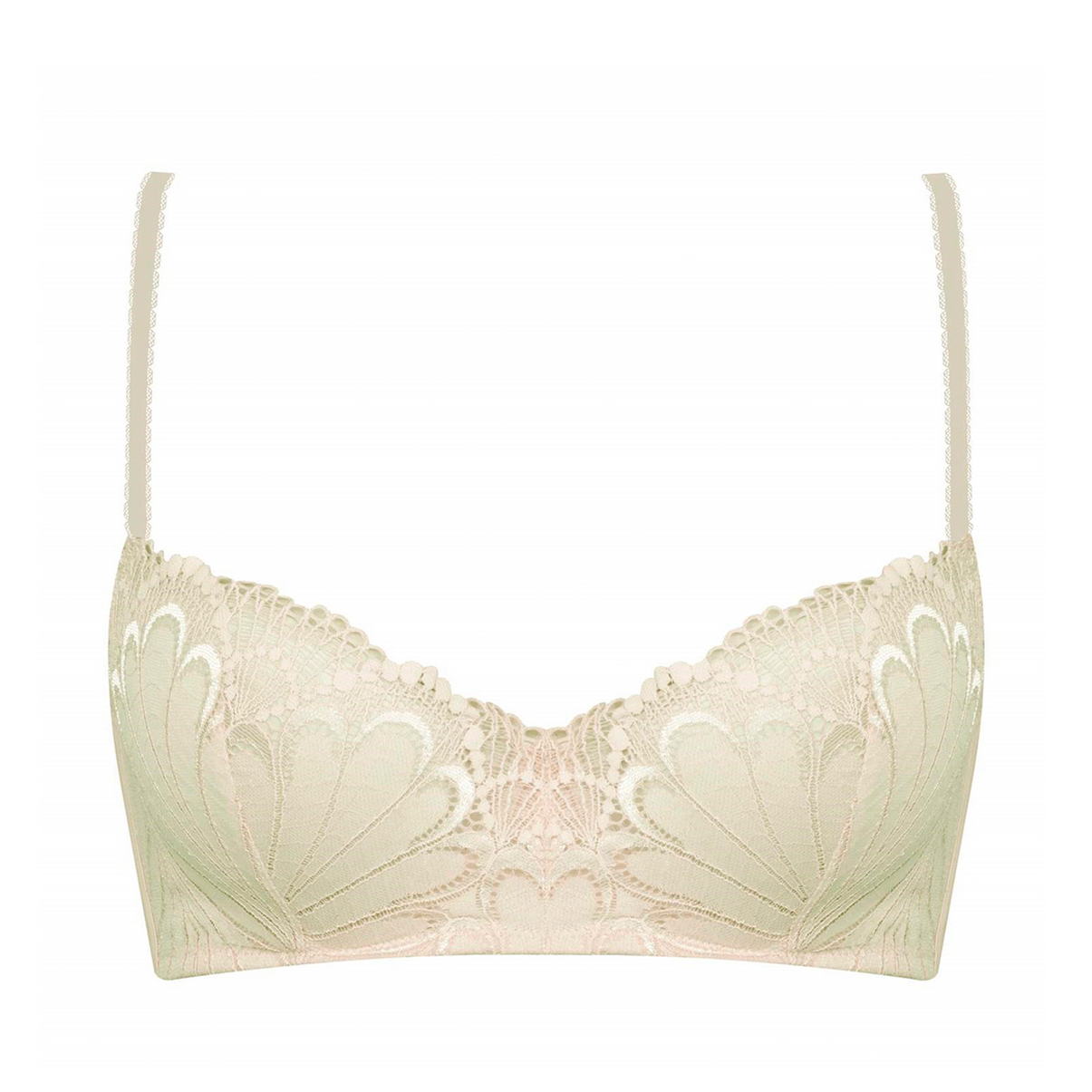 Балконированный бюстгальтер с интегрированными подушками; чашки драпированы красивейшим кружевом с мотивом павлиньих перьев, дополнительная боковая косточка. Бретели декорированы кружевной тесьмой. Чашки бюстгальтера с прослойкой из мусса во всех размерах.