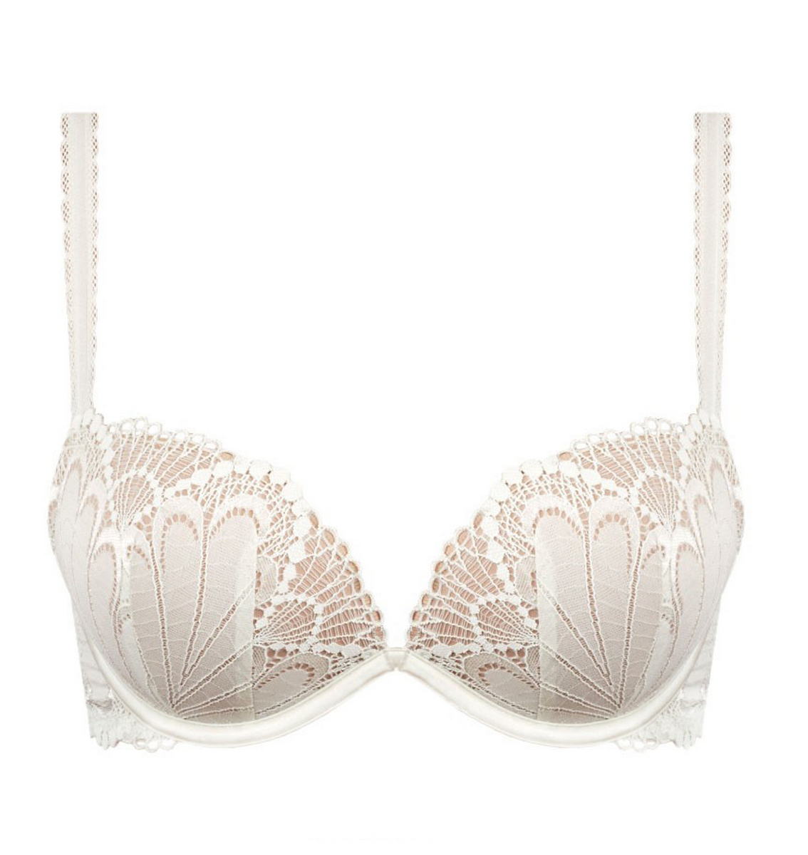 Бюстгальтер - пуш ап с интегрированными подушками, которые наполнены гелем и воздухом, которые придают визуально дополнительный объем до двух размеров. Чашки покрыты невероятно изысканным кружевом с орнаментом "арабески". Тонкая центральная панель. Боковые и задние панели выполнены из эластичной сетки. Глубокий декорированный вырез декольте. Регулирующиеся бретели можно носить крест-на-крест.