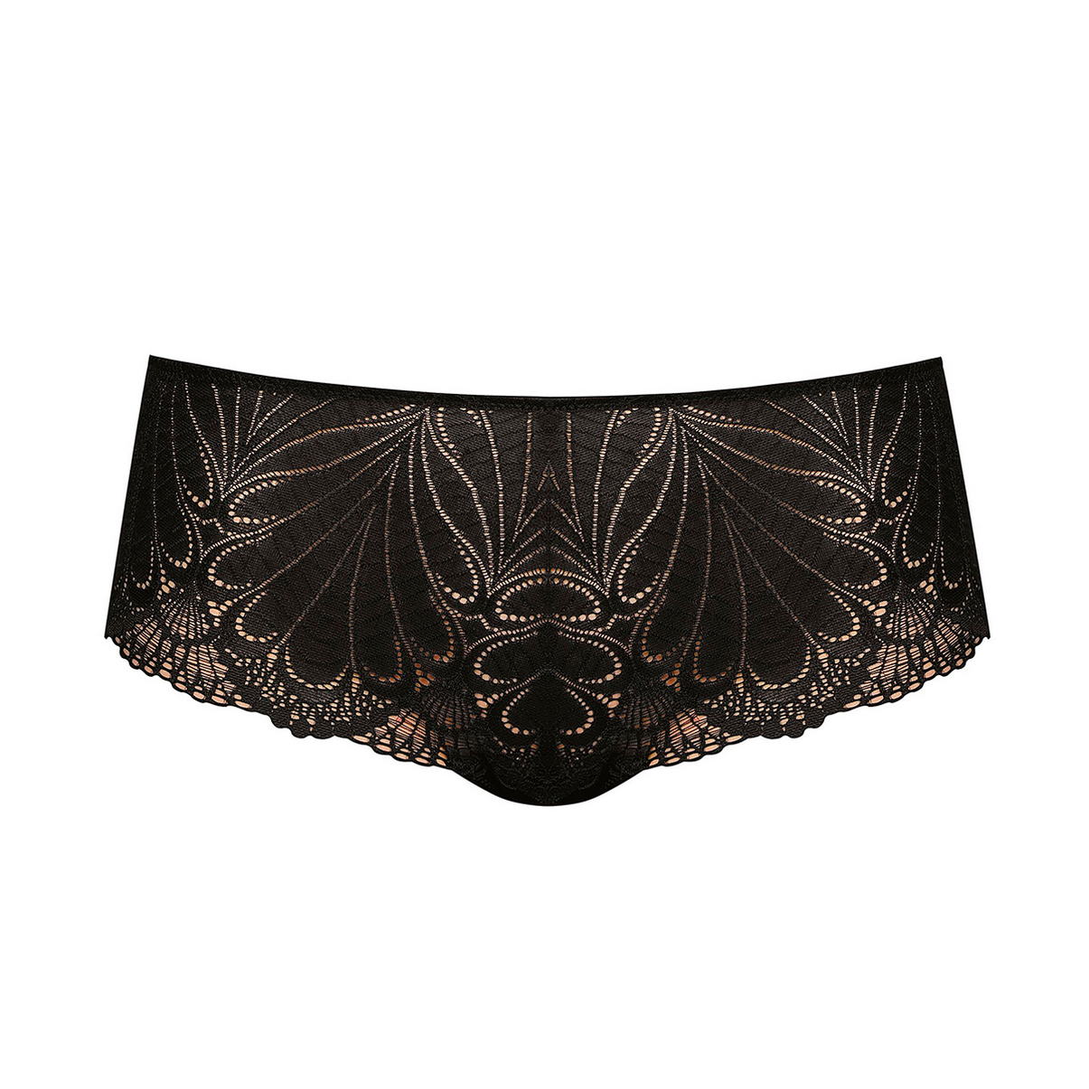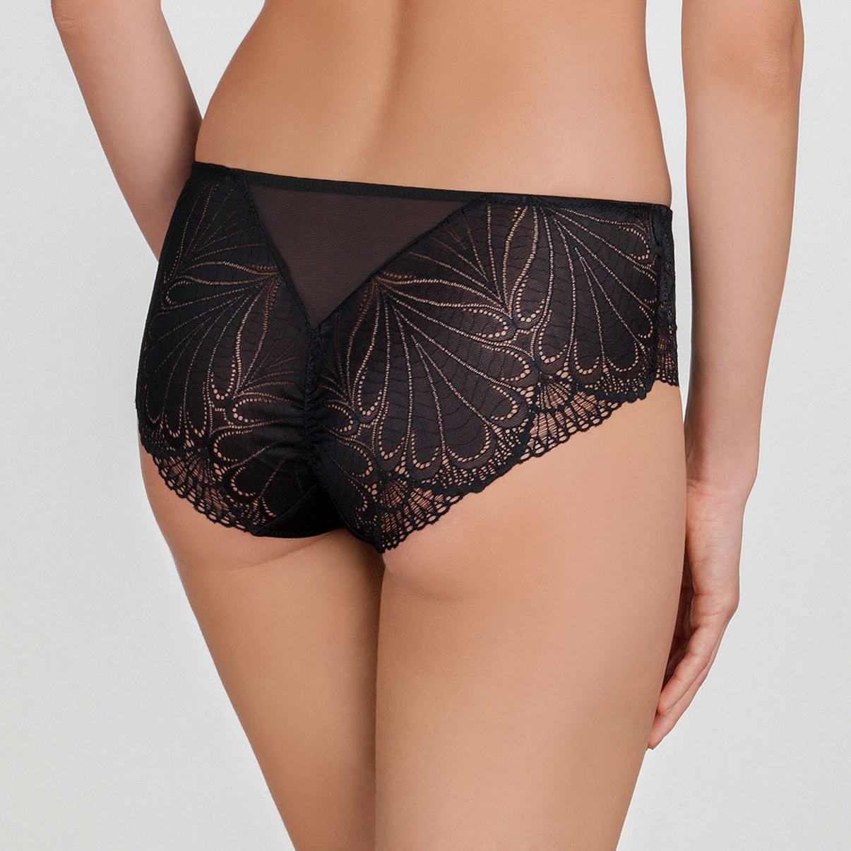 Средне-заниженная форма шортиков, выполненных из красивейшего кружева с мотивом павлиньих перьев; передняя панель кружевная с симметричным подобранным рисунком; на задней панели треугольничек из микрофибры и кружевные волнистые края; хлопковая ластовица.